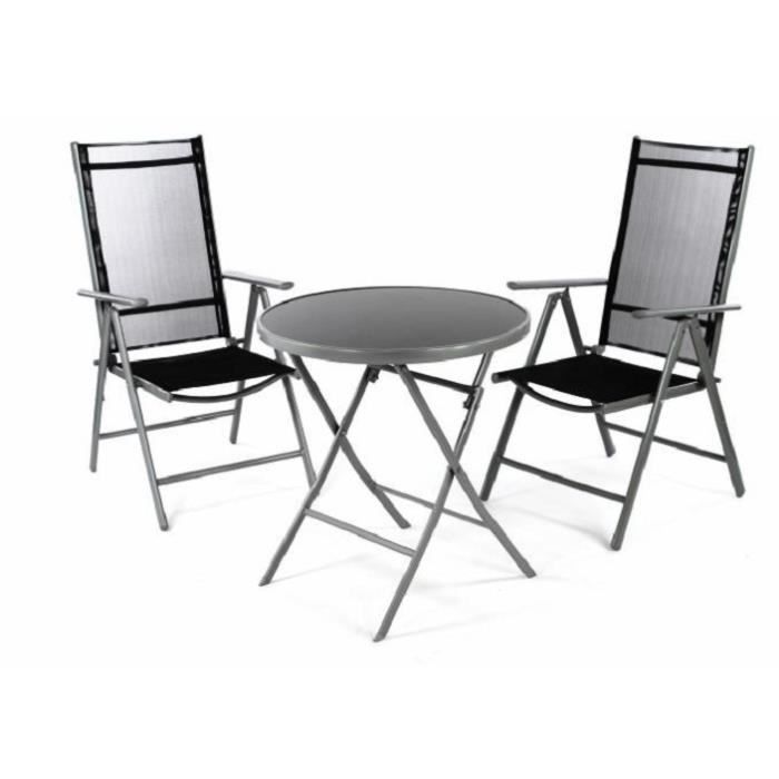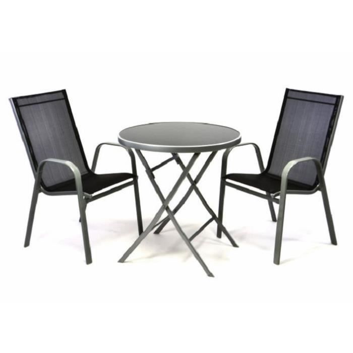 2 Fauteuils Bistro Pliable Table Pliante Ronde Verre Noir